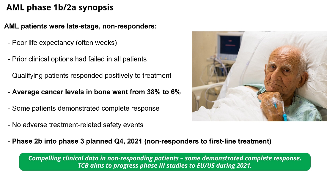 TCB now is embarking on phase 2b-into-pivotal (phase 3) clinical studies with a view to launching its first oncology product for the treatment of AML. Clinical results generated thus far have enabled us to obtain FDA orphan drug status for treatment of AML.